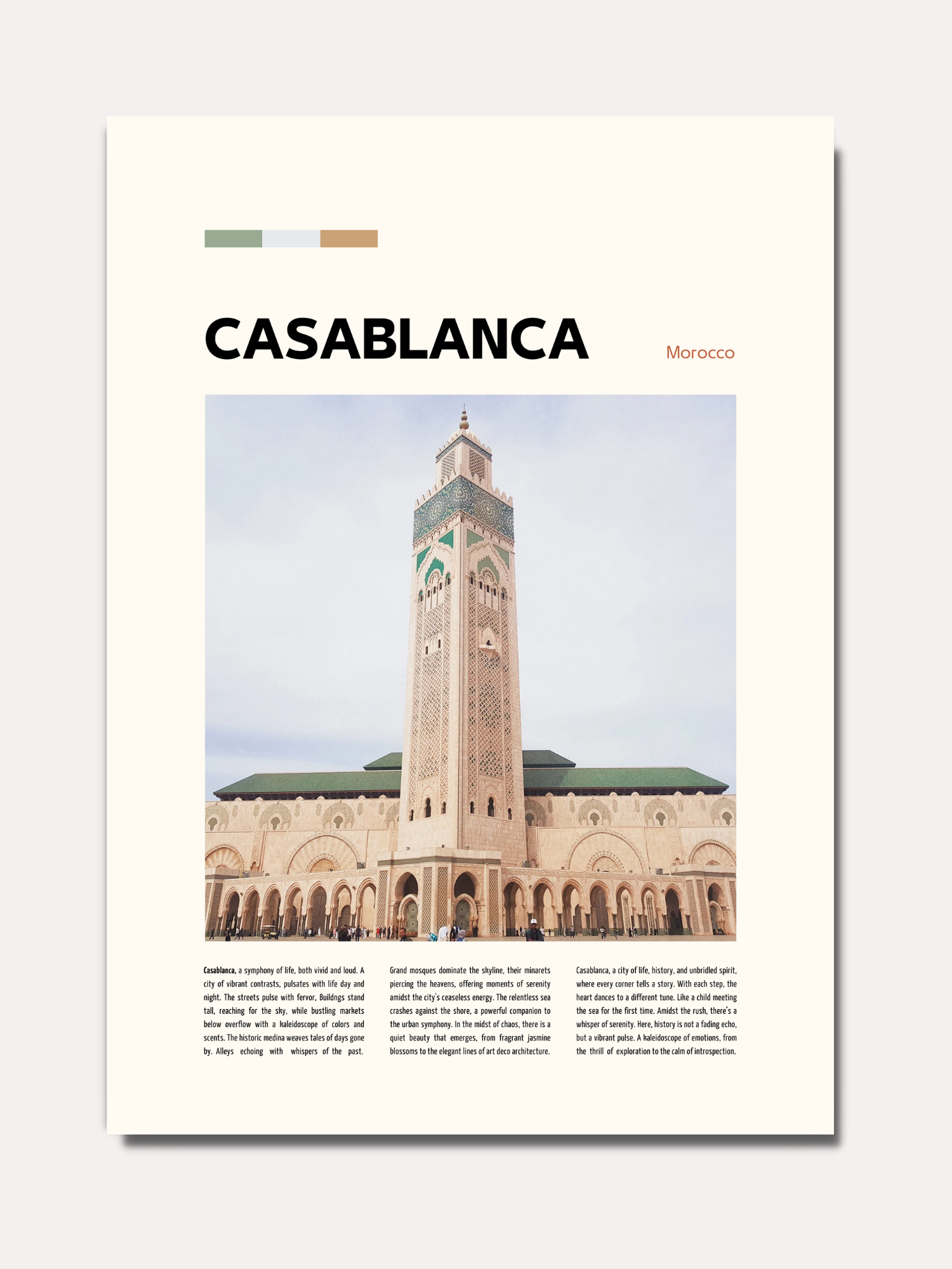 Casablanca, cœur économique dynamique du Maroc, est une ville de gratte-ciel et d'ambition. La mosquée Hassan II est un phare de foi et de splendeur architecturale, tandis que la Corniche offre un avant-goût de la vie nocturne animée et du style de vie contemporain de la ville.